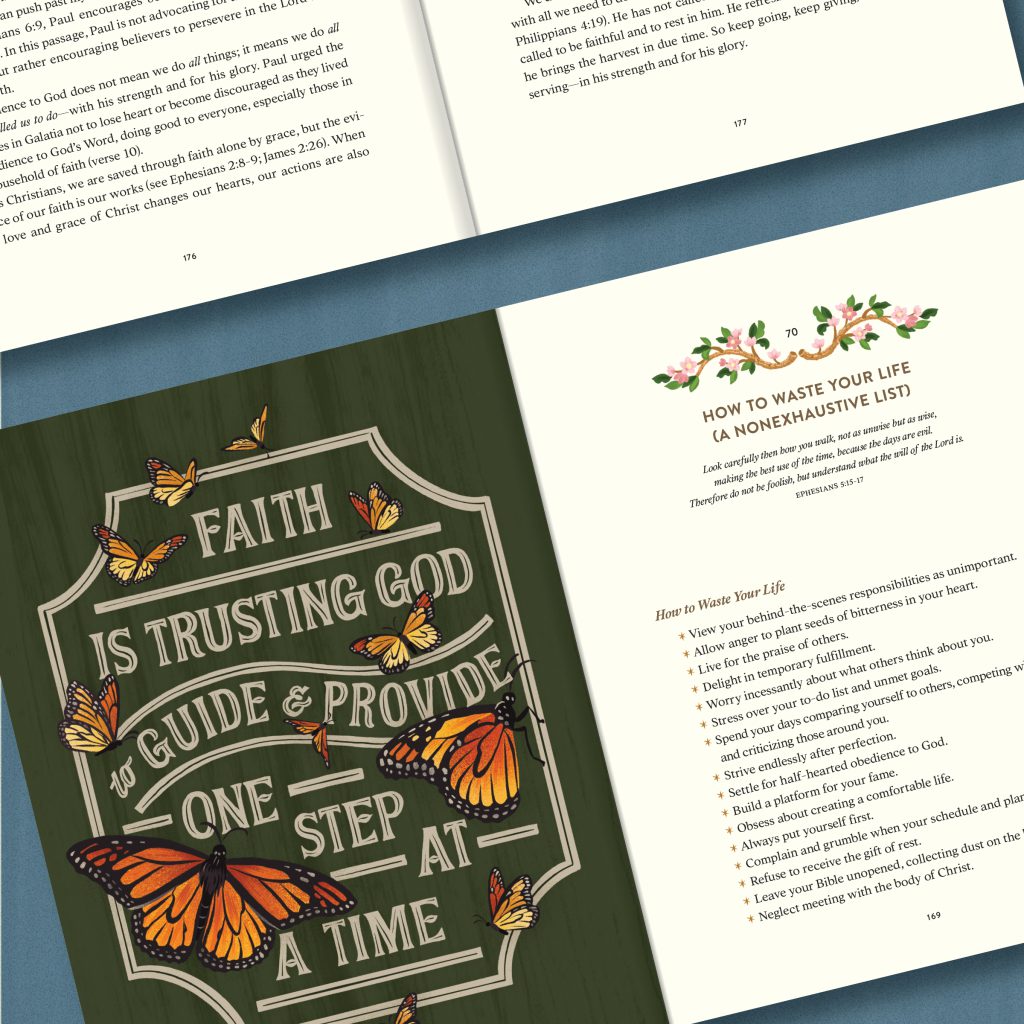 It was a joy getting to work with Jill again and she knocked it out of the park, per usual. The cover combines imagery from a few of Gretchen’s devotionals and personal stories, with the primary concept being an open Bible placed in front of a window (doubling as a vintage frame)… literally showing how we must keep the Word first in our lives before the world.